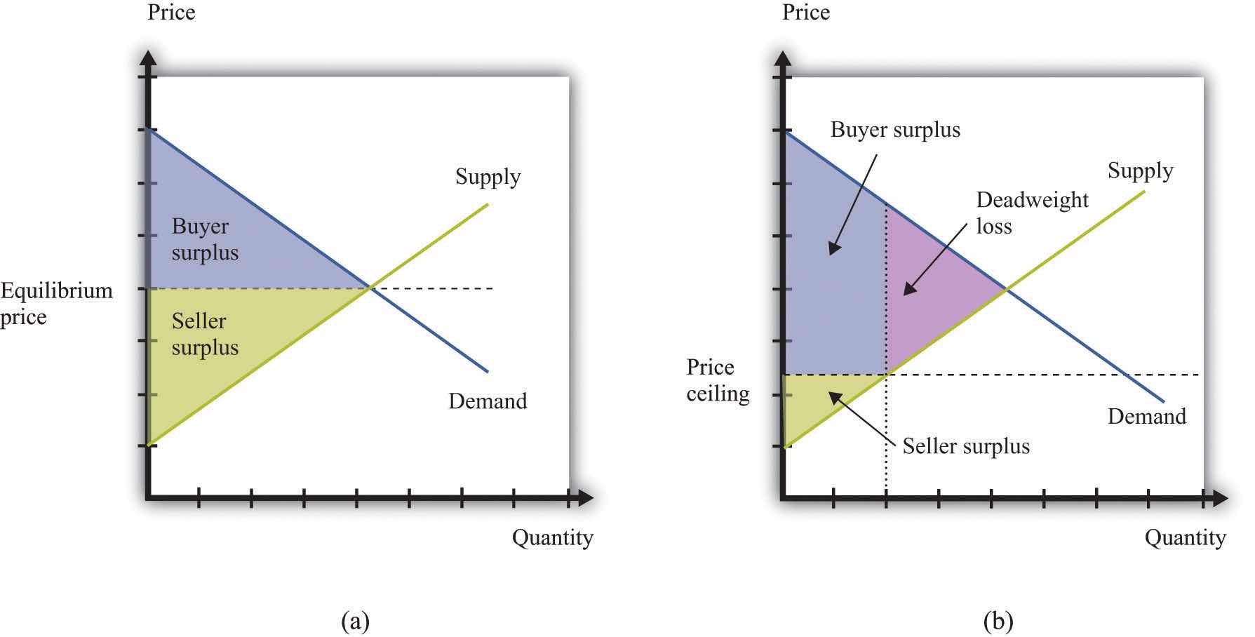 With no price ceiling (a), all the possible gains from trade in the market are realized. With a price ceiling (b), some gains from trade are lost because there are fewer transactions.