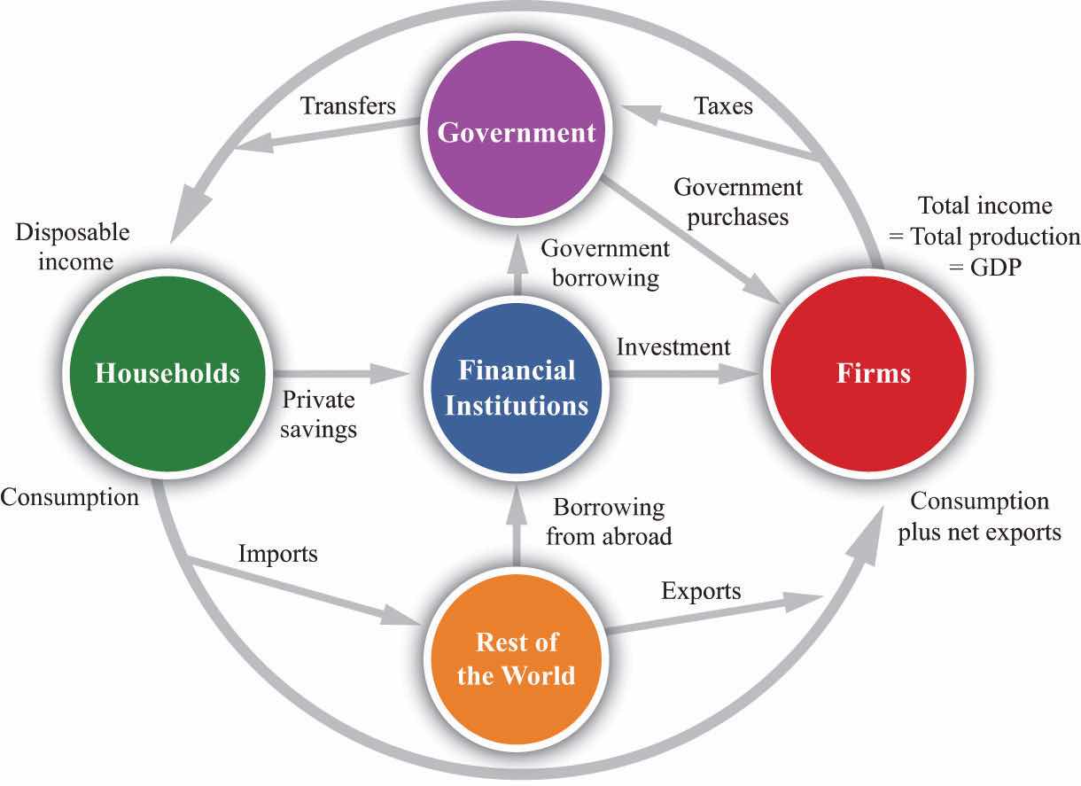 The financial sector of an economy is at the heart of the circular flow. It summarizes the behavior of banks and other financial institutions. Most importantly, this sector of the circular flow shows us that the savings of households provide the source of investment funds for firms. On the left-hand side, the figure shows a flow of dollars from the household sector into financial markets, representing the saving of households. (Though we have not included it in Figure 18.14 "The Complete Circular Flow", firms also save, by means of profits that they retain to finance new investment rather than distribute to their shareholders. As far as the national accounts are concerned, it is as if firms sent these funds to the financial market and then borrowed them back again.) When we borrow from other countries, there is a second flow of dollars into the financial markets. On the right-hand side, there is a flow of money from the financial sector into the firm sector, representing the funds that are available to firms for investment purposes. The linkage between the saving of households and the investment of firms is one of the most important ideas in macroeconomics.