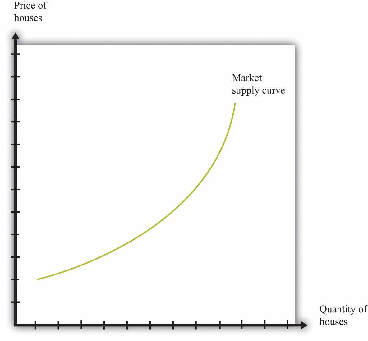 The market supply curve shows the quantity of houses supplied at each price. It has a positive slope: as the price of houses increases, the number of houses supplied to the market increases as well.