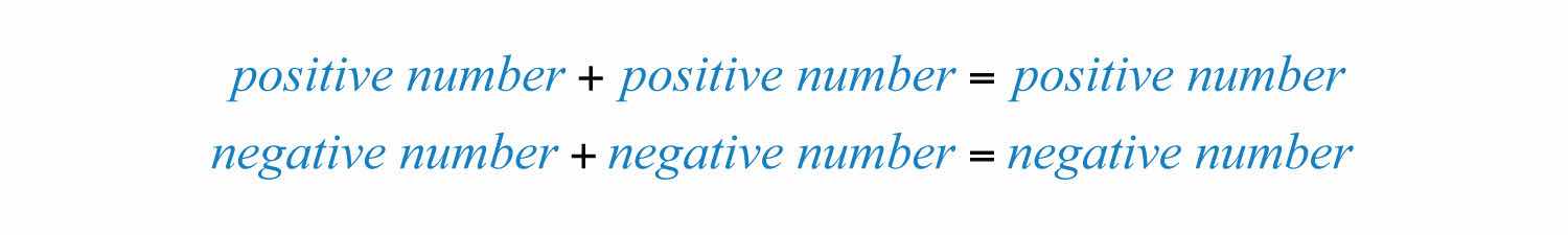 It is tempting to say that a positive number plus a negative number is negative, but that is not always true: . The result of adding numbers with unlike signs may be positive or negative. The sign of the result is the same as the sign of the number with the greatest distance from the origin. For example, the following results depend on the sign of the number 12 because it is farther from zero than 5: