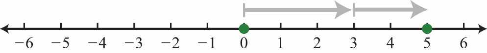 Visualize adding 3 + 2 on the number line by moving from zero three units to the right then another two units to the right, as illustrated below: