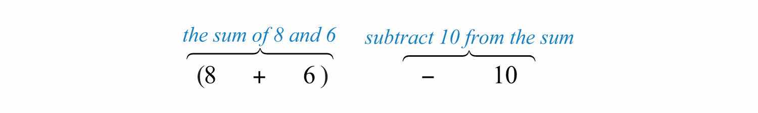 Solution: We know that subtraction is not commutative; therefore, we must take care to subtract in the correct order. First, add 8 and 6 and then subtract 10 as follows: