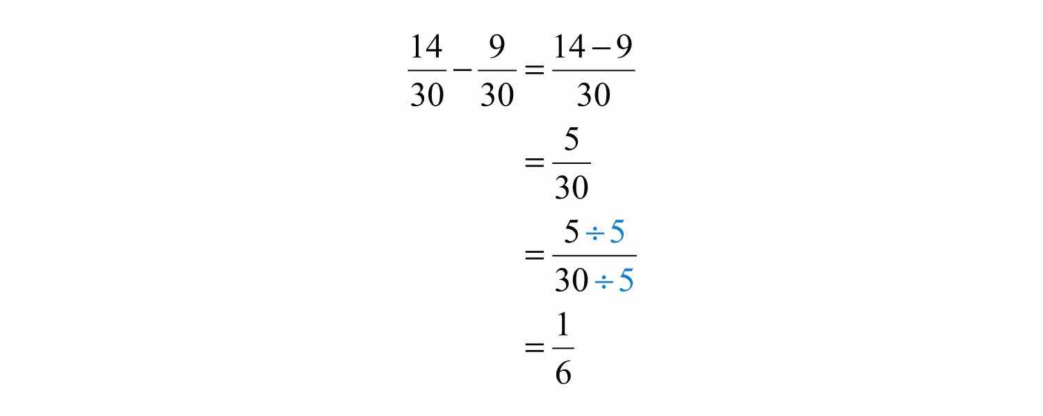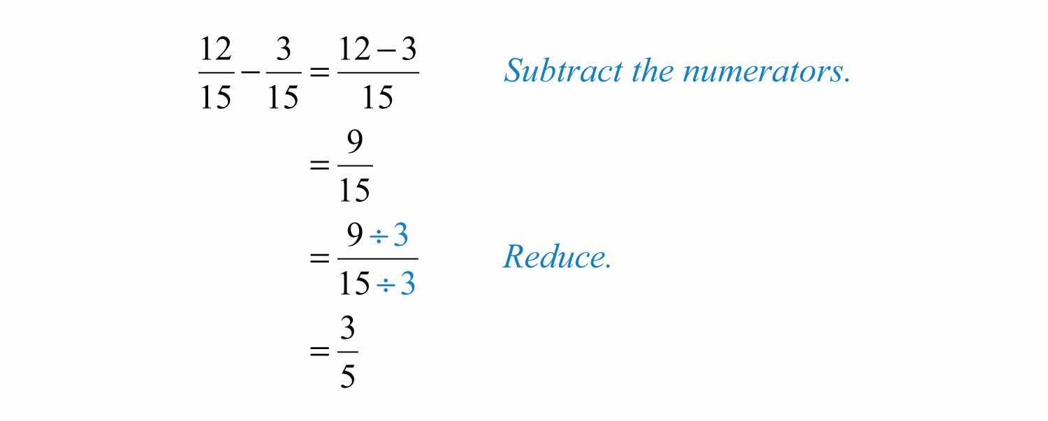 Solution: The two fractions have a common denominator 15. Therefore, subtract the numerators and write the result over the common denominator: