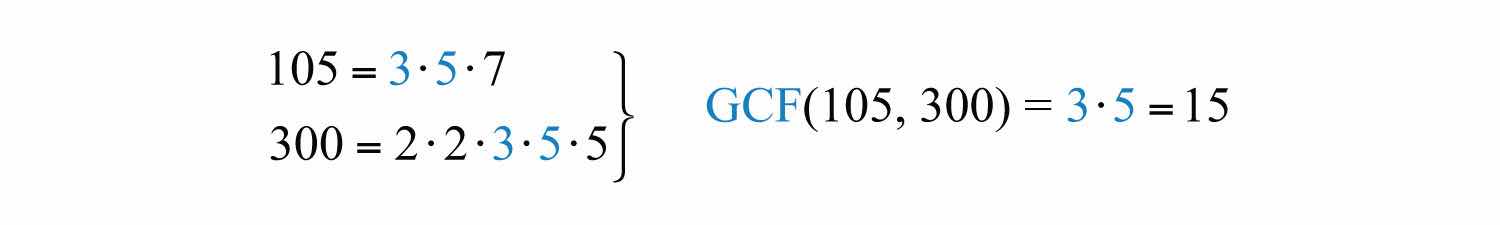 In this case, the common prime factors are 3 and 5 and the greatest common factor of 105 and 300 is 15.