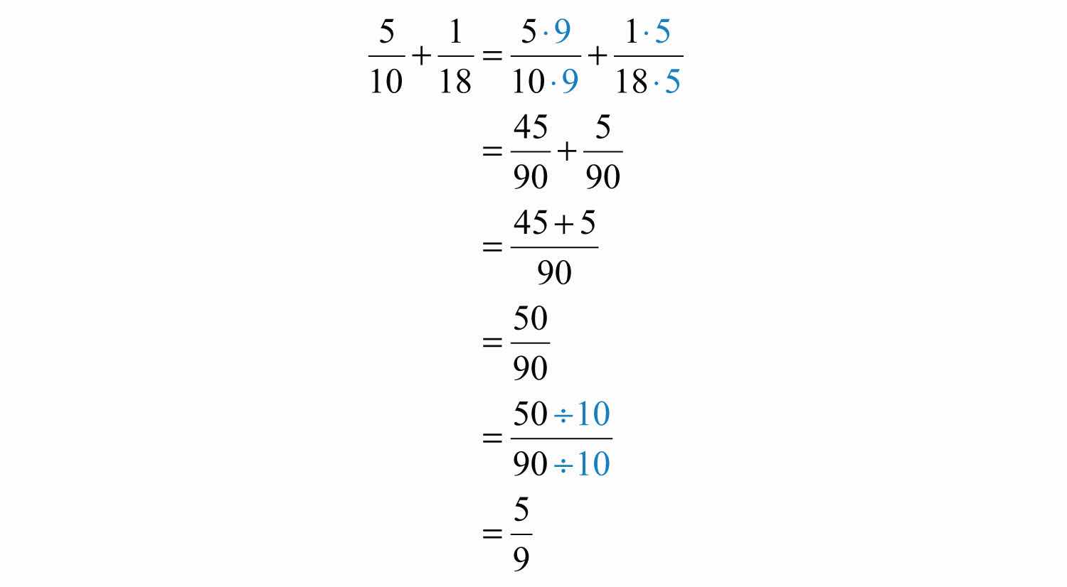 Solution: First, determine that the LCM(10, 18) is 90 and then find equivalent fractions with 90 as the denominator.