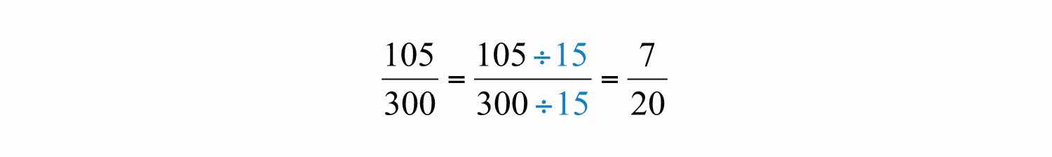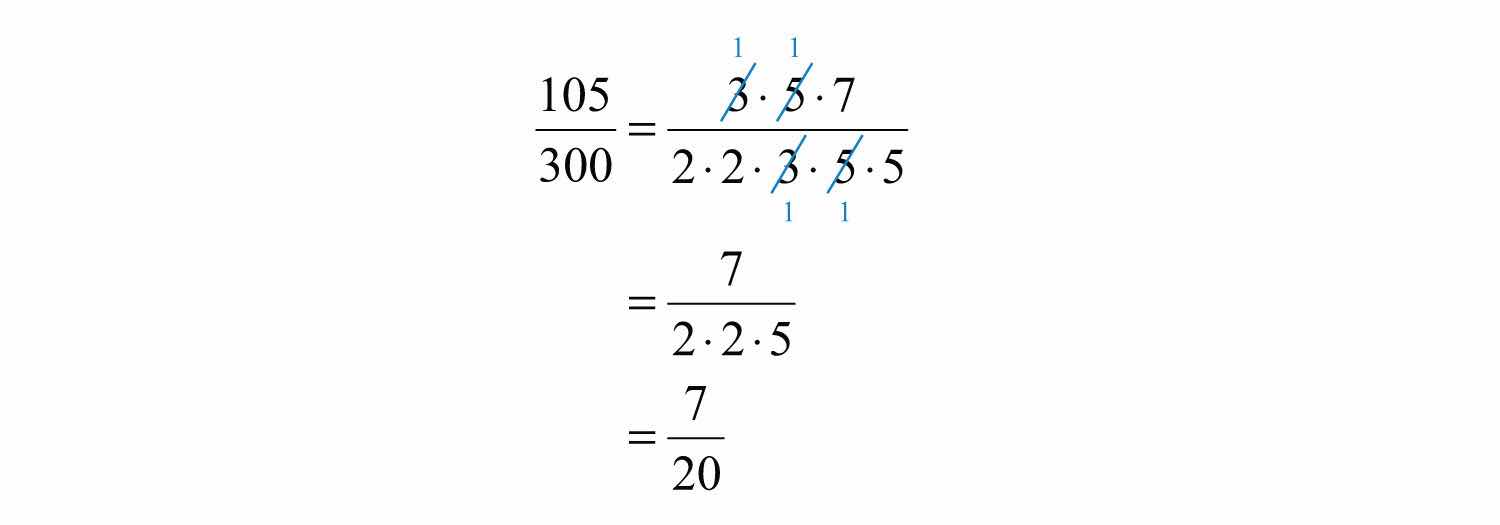 Alternatively, we achieve the same result if we divide both the numerator and denominator by the GCF(105, 300). A quick way to find the GCF of the two numbers requires us to first write each as a product of primes. The GCF is the product of all the common prime factors.