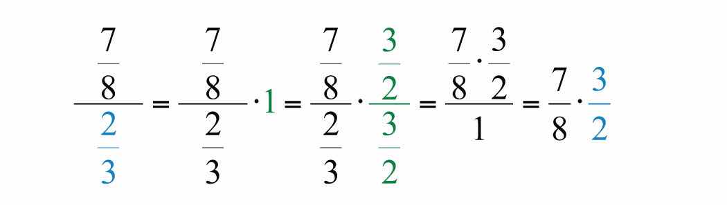 Students often ask why dividing is equivalent to multiplying by the reciprocal of the divisor. A mathematical explanation comes from the fact that the product of reciprocals is 1. If we apply the multiplicative identity property and multiply numerator and denominator by the reciprocal of the denominator, then we obtain the following: