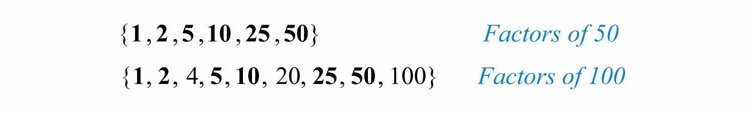 Common factors are listed in bold, and we see that the greatest common factor is 50. We use the following notation to indicate the GCF of two numbers: GCF(50, 100) = 50. After determining the GCF, reduce by dividing both the numerator and the denominator as follows: