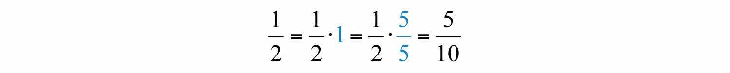 Most problems that you are likely to encounter will have unlike denominatorsDenominators of fractions that are not the same.. In this case, first find equivalent fractions with a common denominator before adding or subtracting the numerators. One way to obtain equivalent fractions is to divide the numerator and the denominator by the same number. We now review a technique for finding equivalent fractions by multiplying the numerator and the denominator by the same number. It should be clear that 5/5 is equal to 1 and that 1 multiplied times any number is that number: