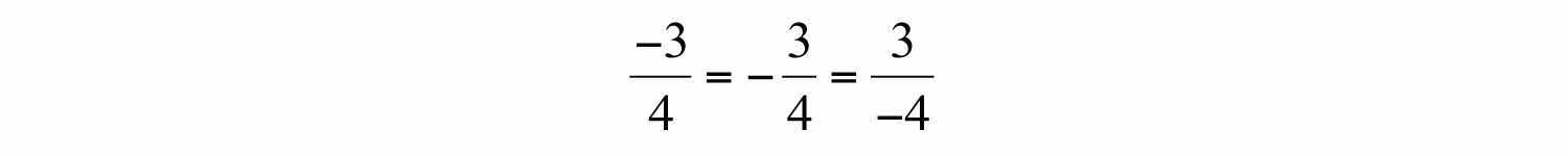 Negative fractions are indicated with the negative sign in front of the fraction bar, in the numerator, or in the denominator. All such forms are equivalent and interchangeable.