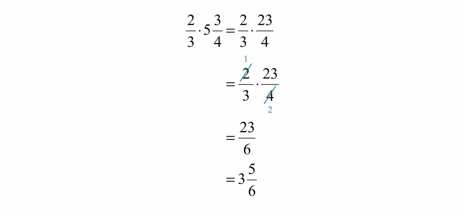 In this example, we noticed that we could reduce before we multiplied the numerators and the denominators. Reducing in this way is called cross cancelingCancelling common factors in the numerator and the denominator of fractions before multiplying., and can save time when multiplying fractions.