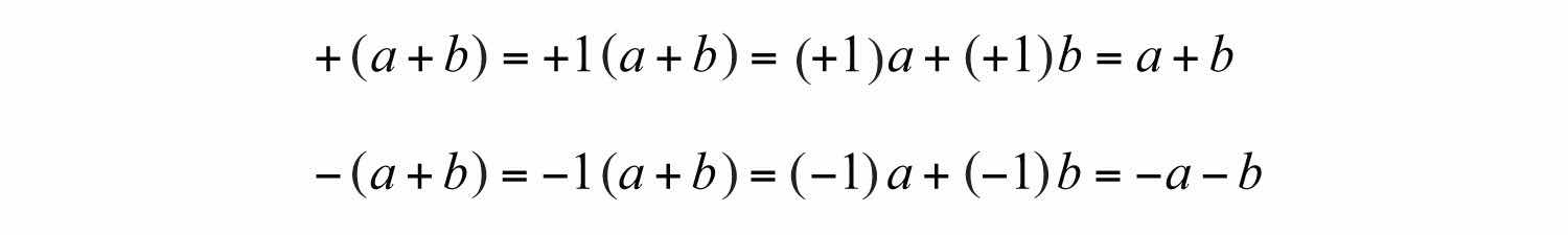 Often we will encounter algebraic expressions like or . As we have seen, the coefficients are actually implied to be +1 and −1, respectively, and therefore, the distributive property applies using +1 or –1 as the factor. Multiply each term within the parentheses by these factors:
