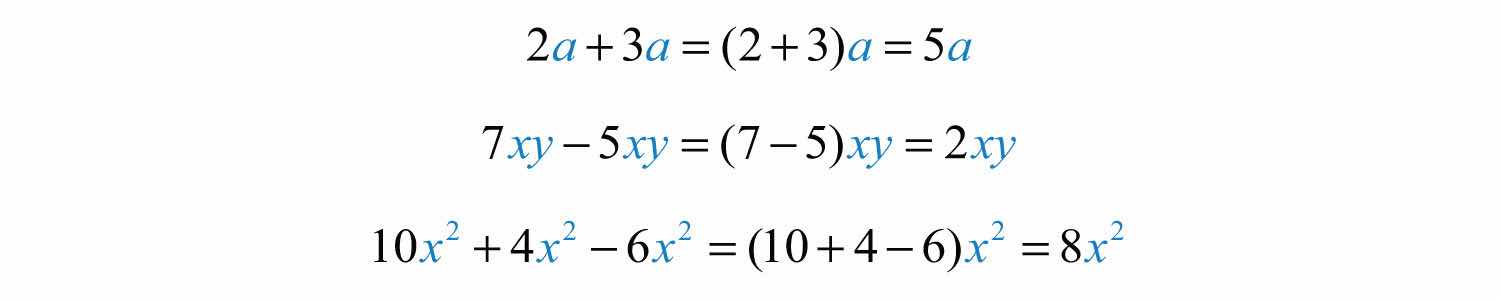 In other words, if the variable parts of terms are exactly the same, then we may add or subtract the coefficients to obtain the coefficient of a single term with the same variable part. This process is called combining like termsAdding or subtracting like terms within an algebraic expression to obtain a single term with the same variable part.. For example,