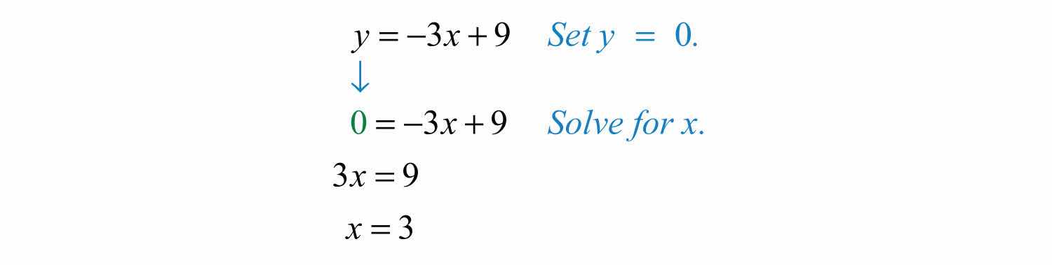 To find the x- and y-intercepts algebraically, use the fact that all x-intercepts have a y-value of zero and all y-intercepts have an x-value of zero. To find the y-intercept, set and determine the corresponding y-value. Similarly, to find the x-intercept, set and determine the corresponding x-value.