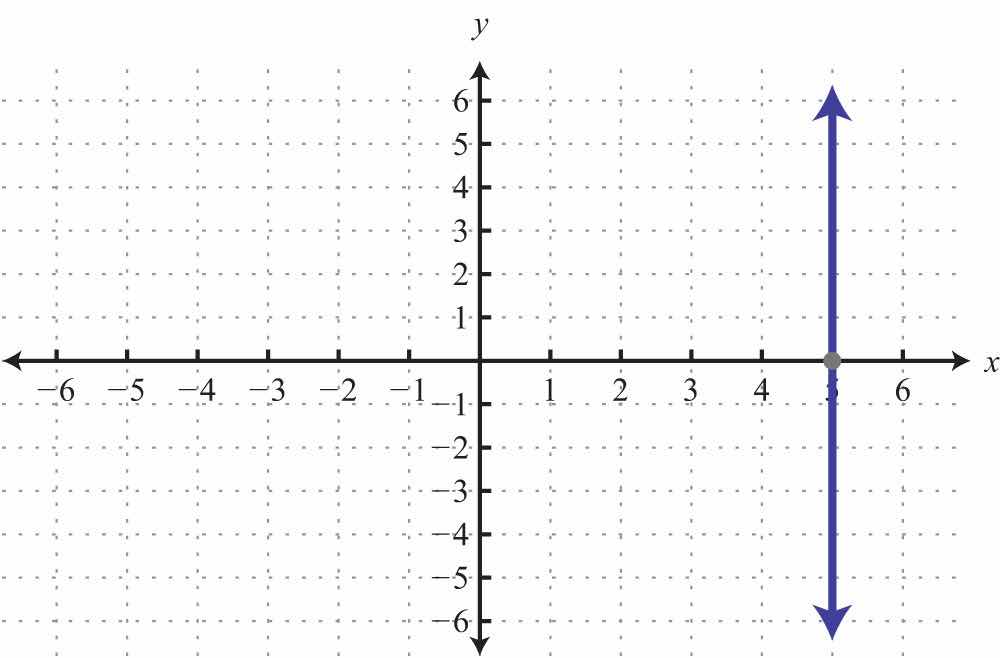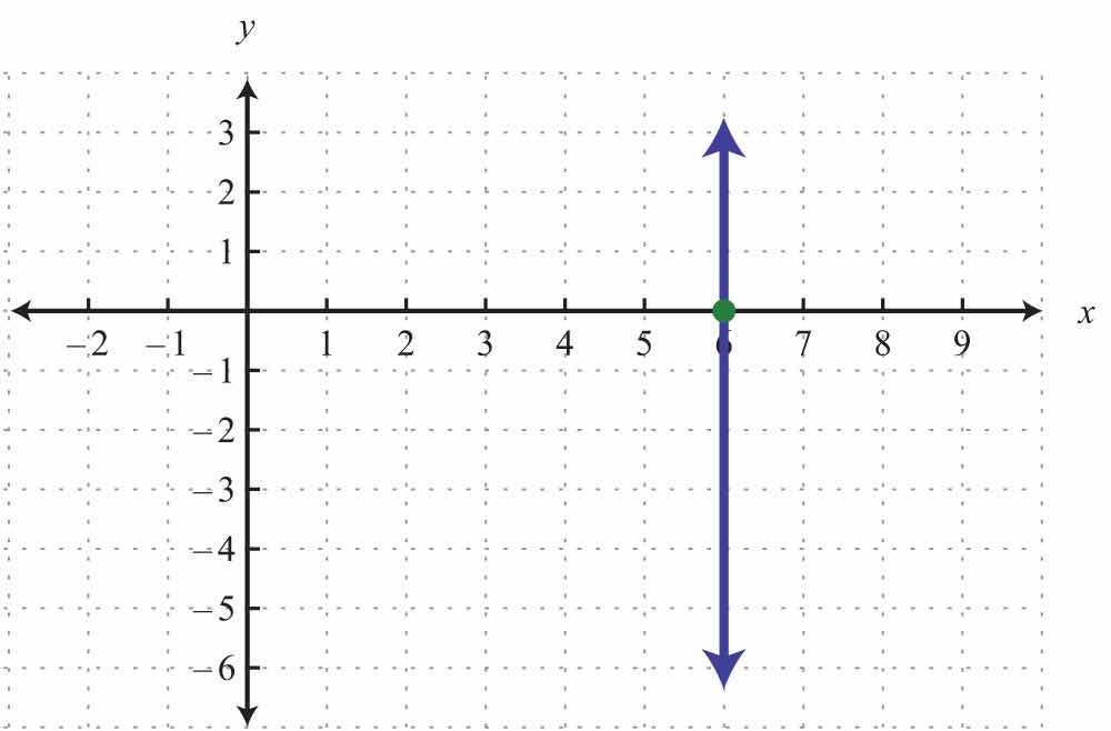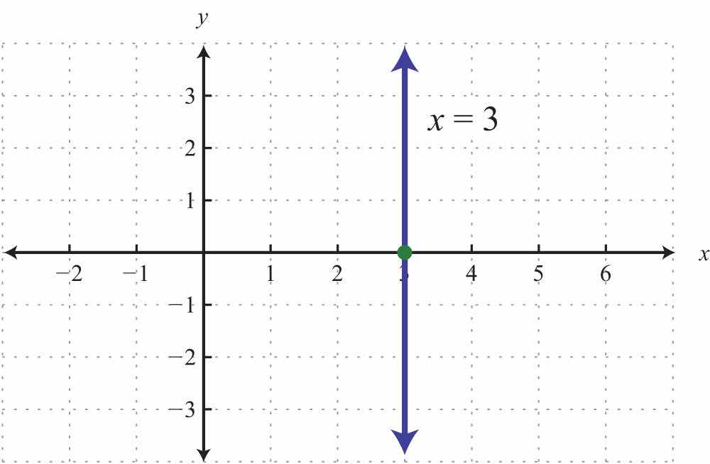 The vertical line graphed above has an x-intercept (3, 0) and no y-intercept.