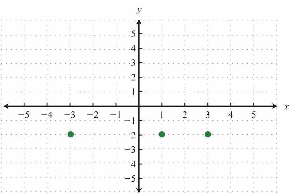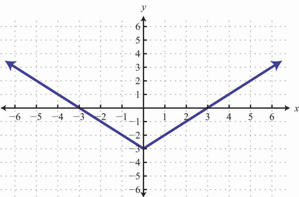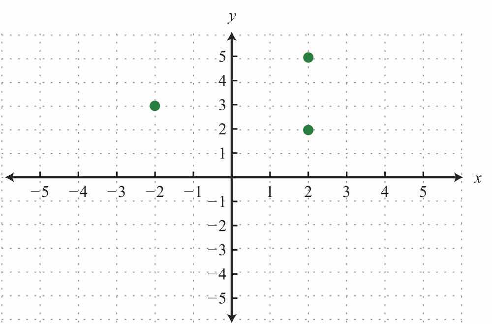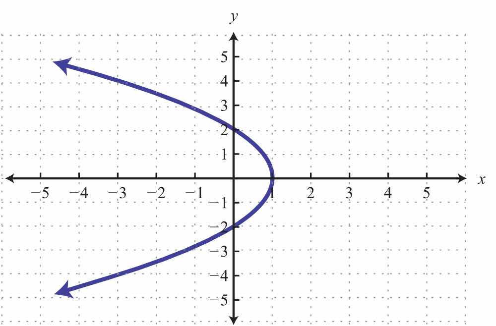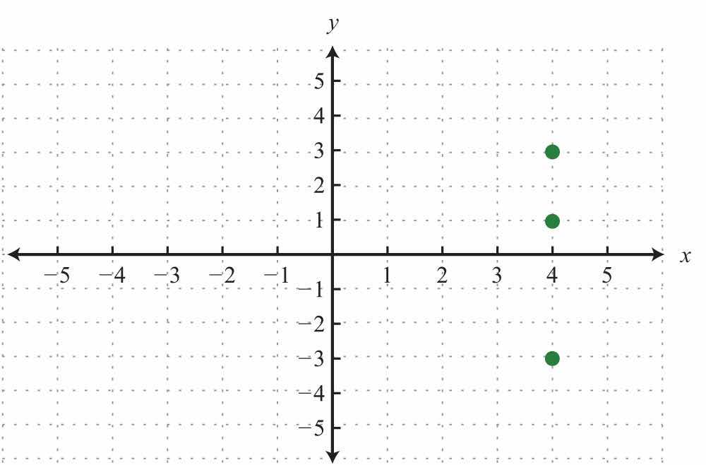 Here the graph represents a relation where many x-values in the domain correspond to two y-values. If we draw a vertical line, as illustrated, we can see that (3, 2) and (3, −2) are two ordered pairs with the same x-value. Therefore, the x-value 3 corresponds to two y-values; hence the graph does not represent a function. The illustration suggests that if any vertical line intersects a graph more than once, then the graph does not represent a function. This is called the vertical line testIf a vertical line intersects a graph more than once, then the graph does not represent a function..