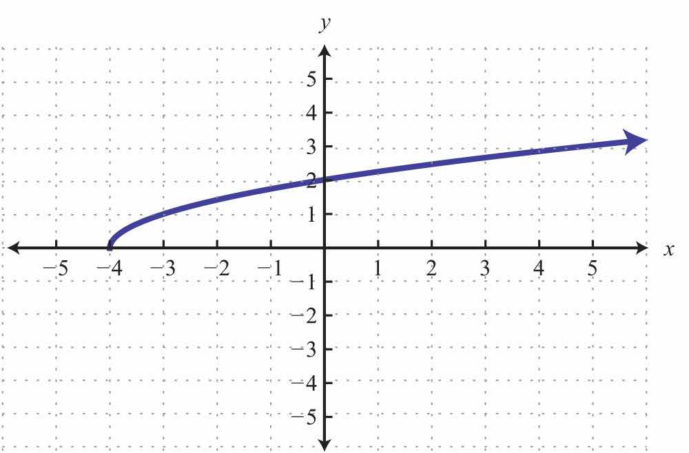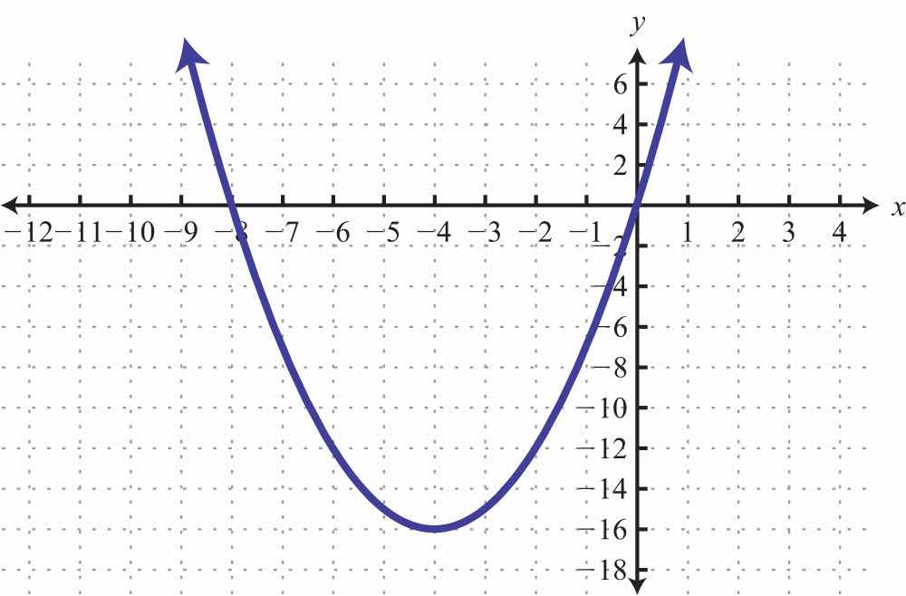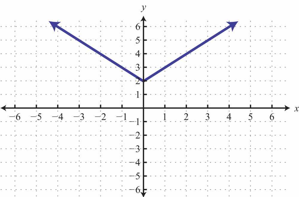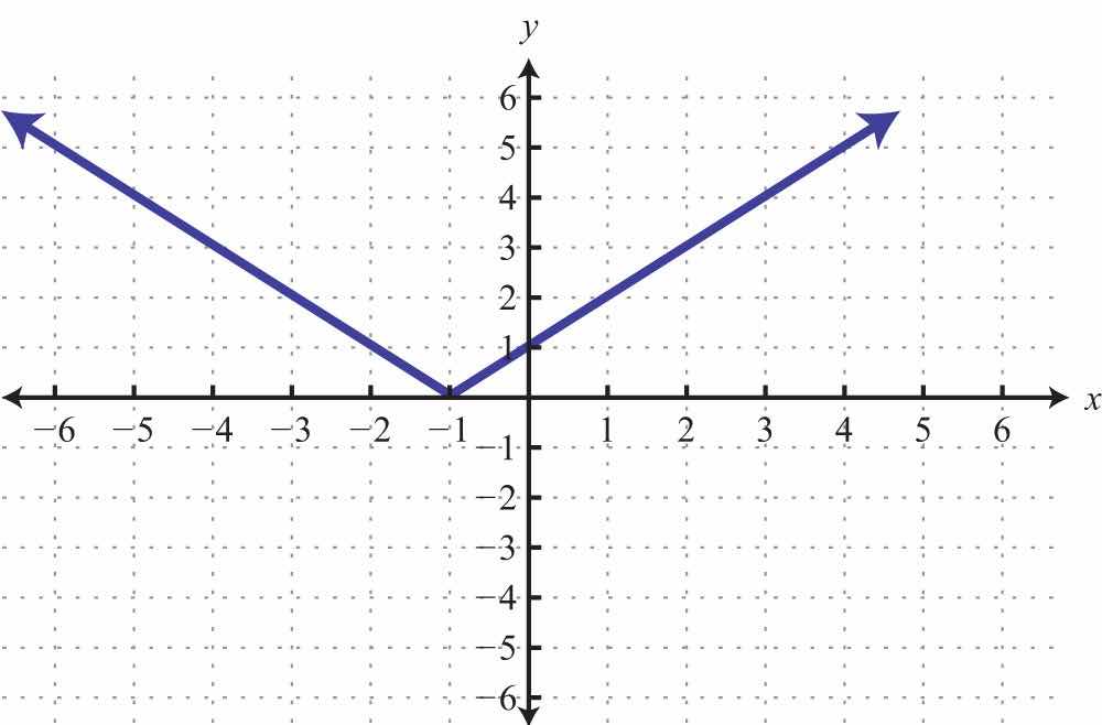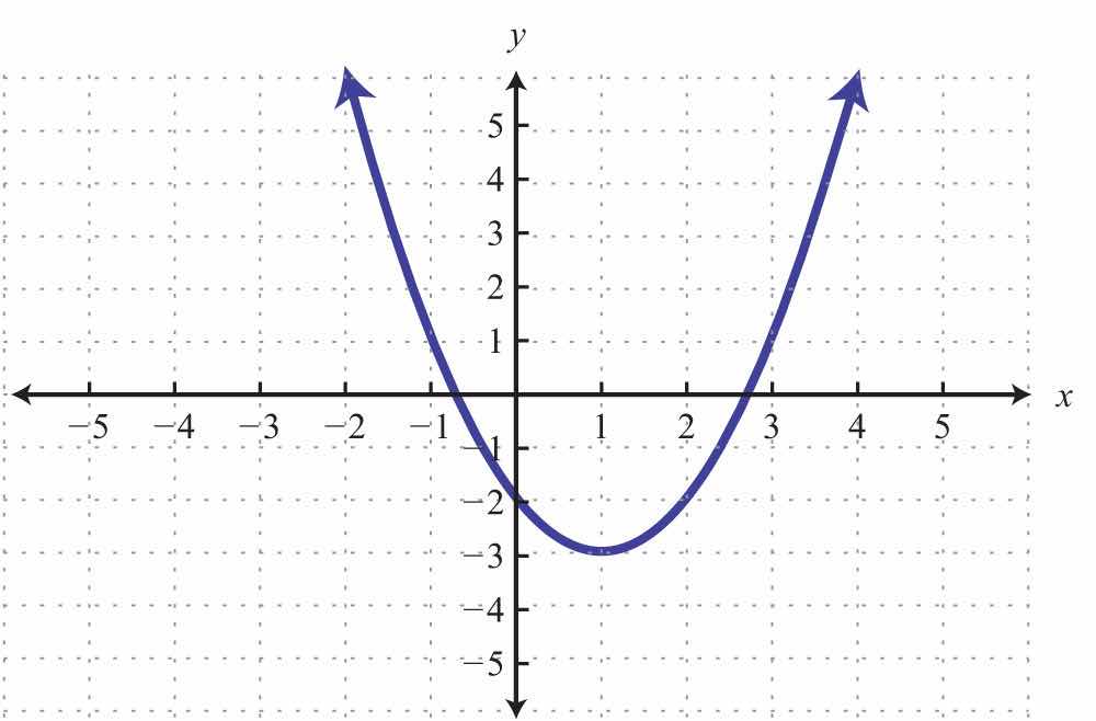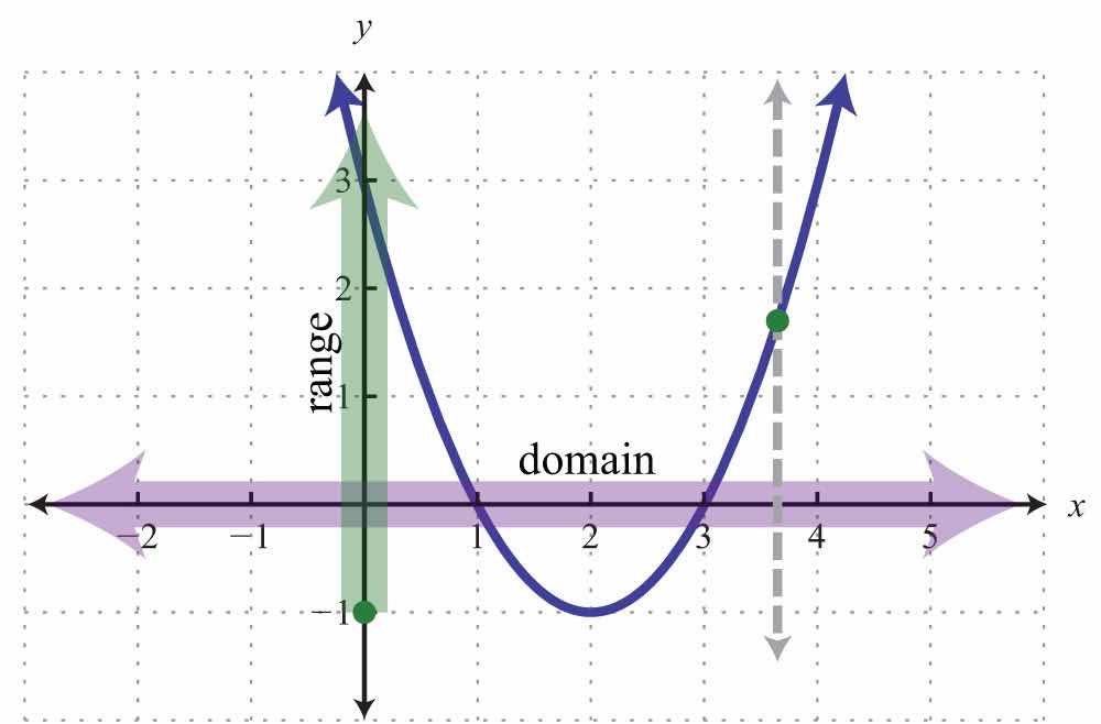 Solution: The given shape is called a parabola and extends indefinitely to the left and right as indicated by the arrows. This suggests that if we choose any x-value, then we will be able to find a corresponding point on the graph; therefore, the domain consists of all real numbers. Furthermore, the graph shows that −1 is the minimum y-value, and any y-value greater than that is represented in the relation. Hence the range consists of all y-values greater than or equal to −1, or in interval notation, [1,).