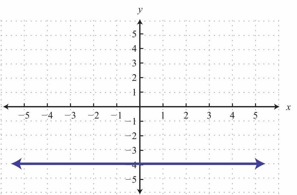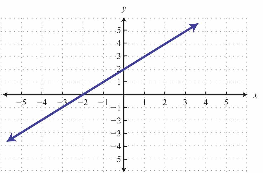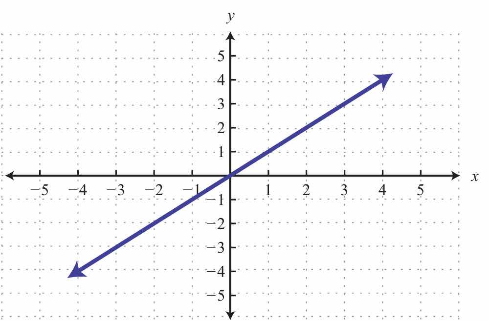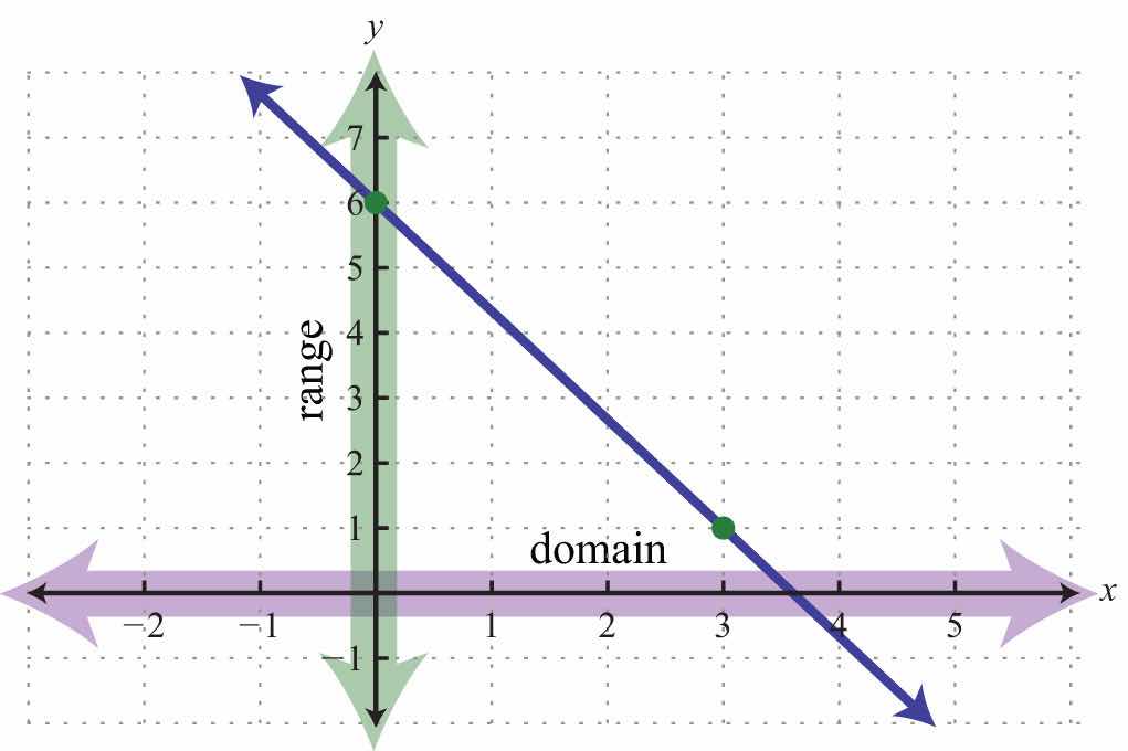 The graph is a relation since it represents the infinite set of ordered pair solutions to y=34x2. The domain is the set of all x-values, and in this case consists of all real numbers. The range is the set of all possible y-values, and in this case also consists of all real numbers. Furthermore, the graph is a function because for each x-value there is only one corresponding y-value. In fact, any nonvertical or nonhorizontal line is a function with domain and range consisting of all real numbers.
