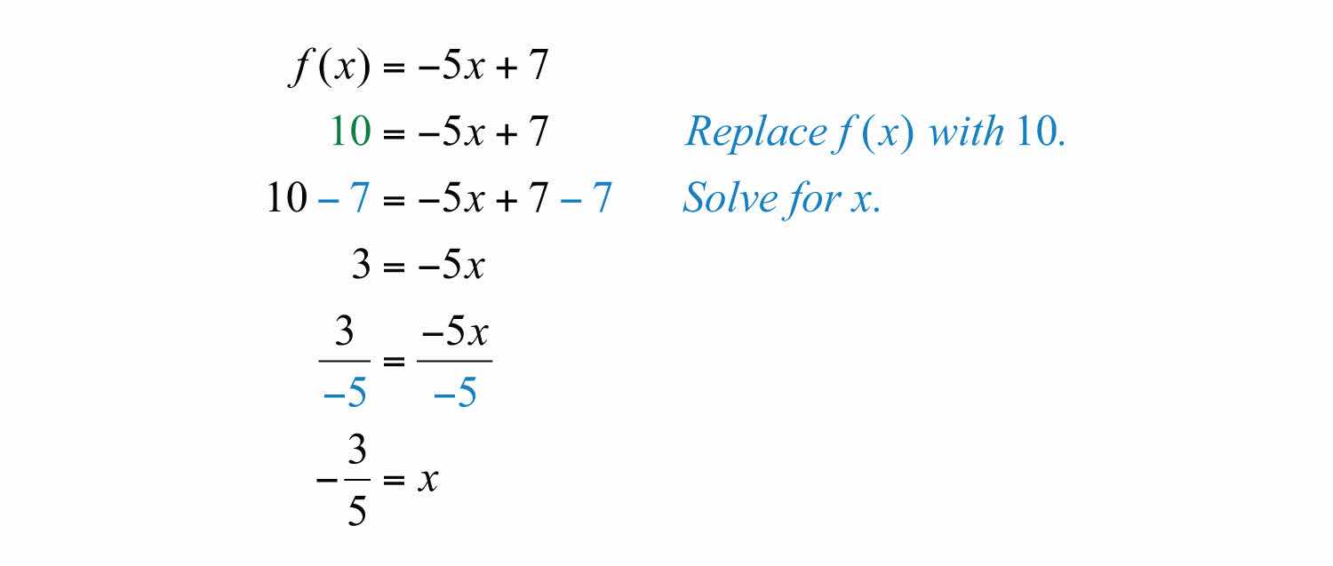 Example 5: Given the linear function f(x)=5x+7, find x when f(x)=10.