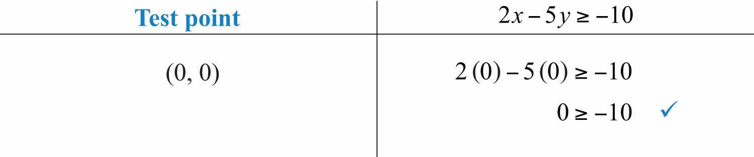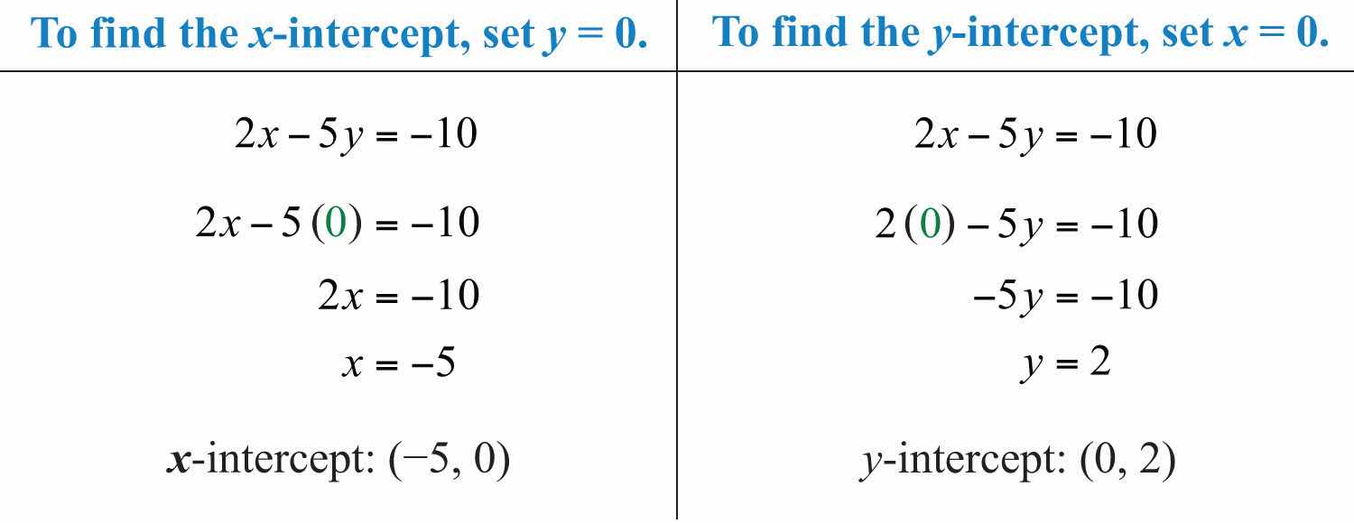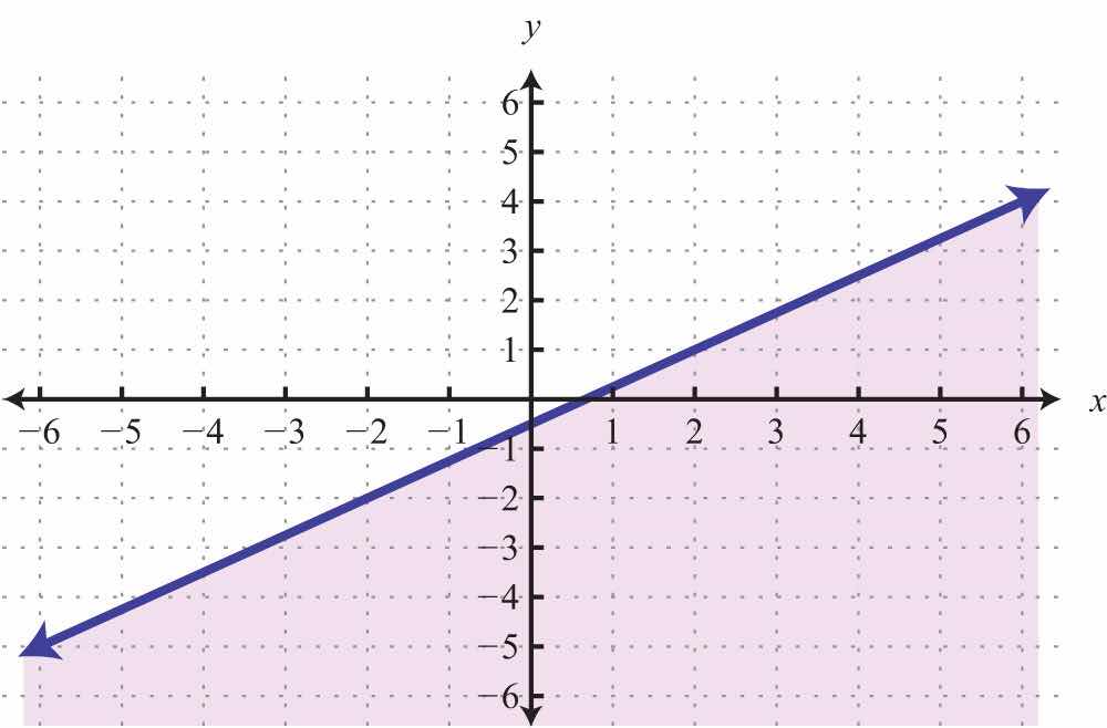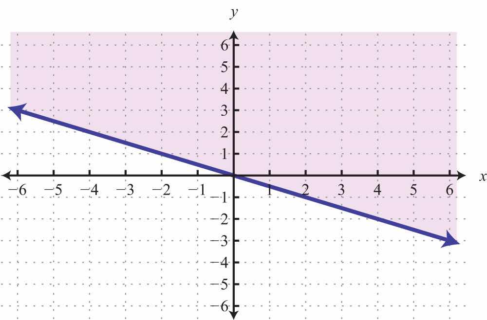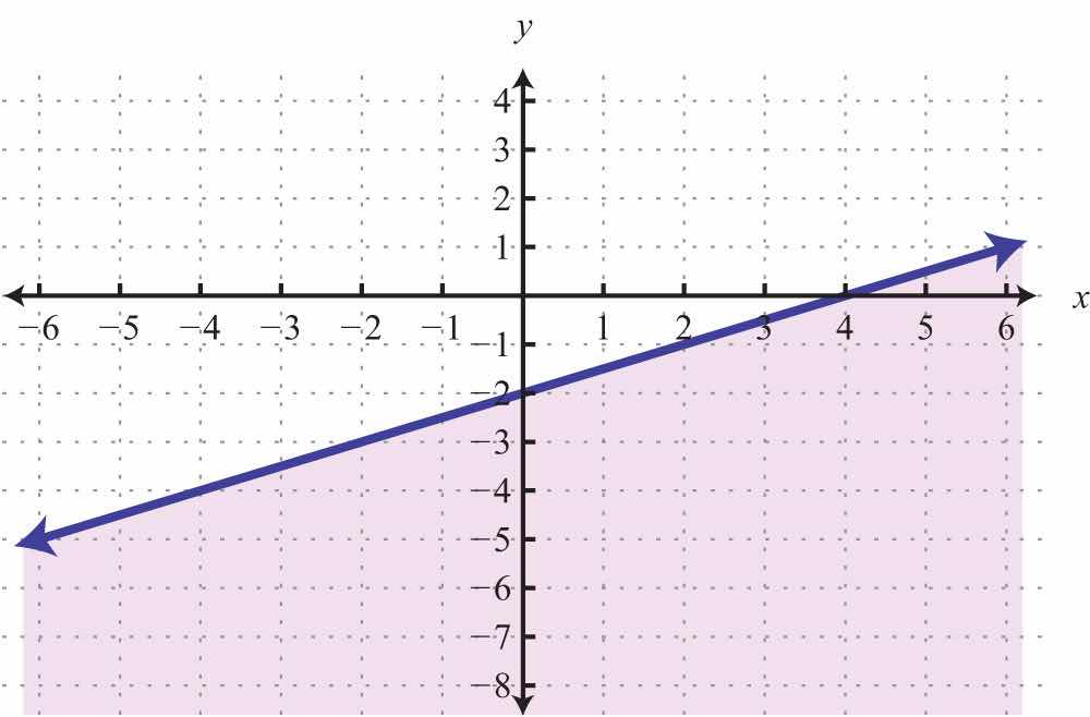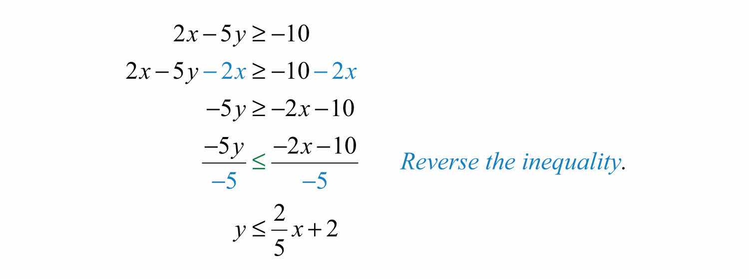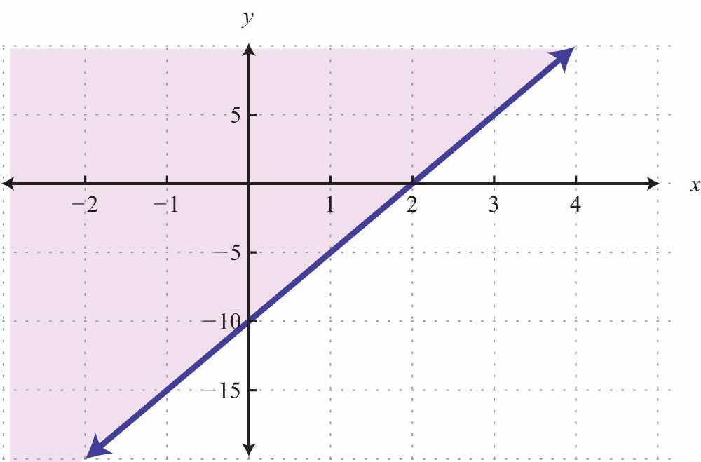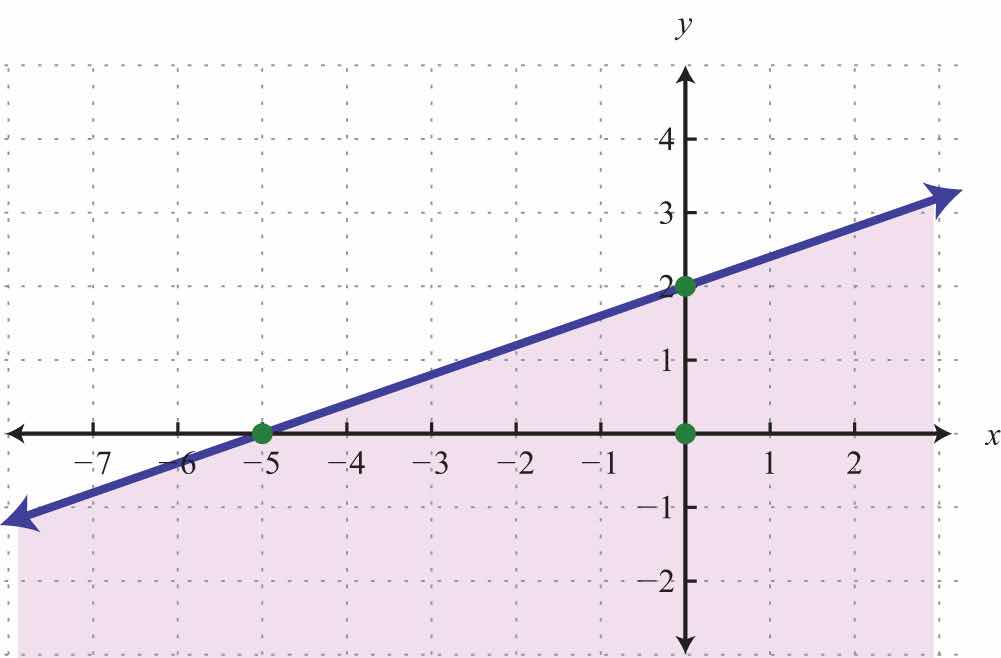 Solution: Here the boundary is defined by the line 2x5y=10. Since the inequality is inclusive, we graph the boundary using a solid line. In this case, graph the boundary line using intercepts.