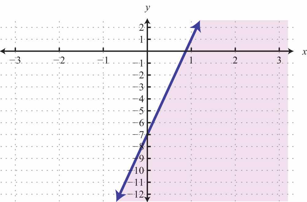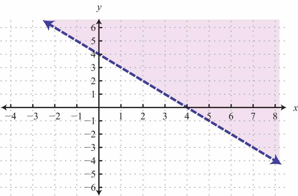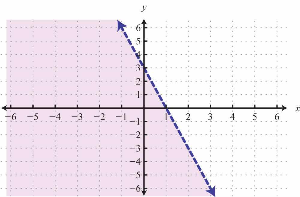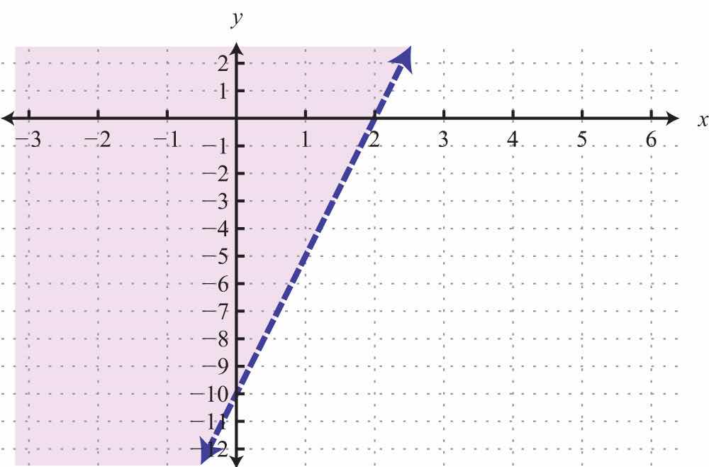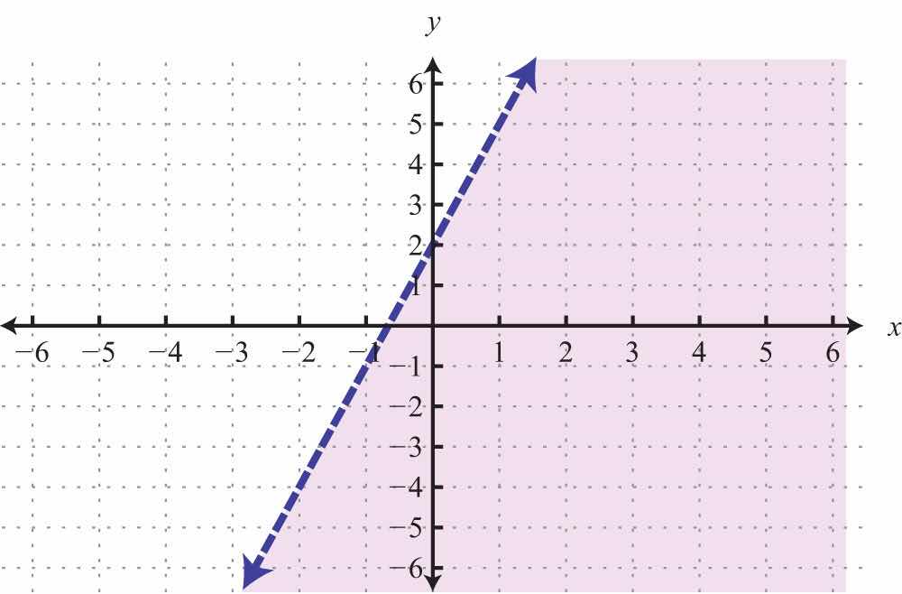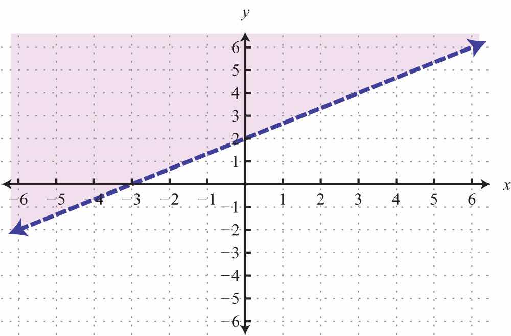 The graph of the solution set to a linear inequality is always a region. However, the boundary may not always be included in that set. In the previous example, the line was part of the solution set because of the “or equal to” part of the inclusive inequality . If we have a strict inequality <, we would then use a dashed line to indicate that those points are not included in the solution set.