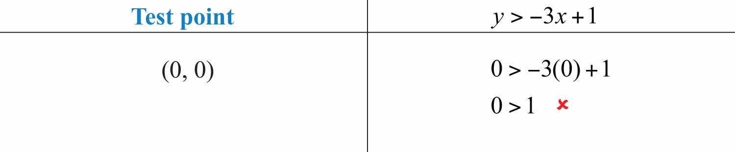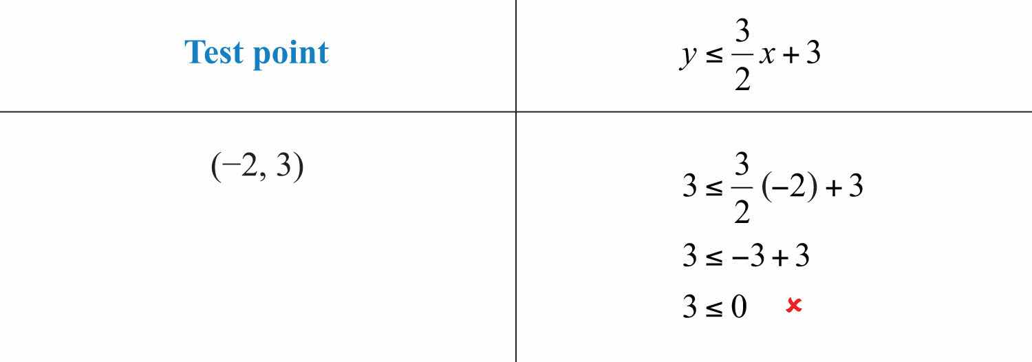 For the inequality, the line defines one boundary of the region that is shaded. This indicates that any ordered pair that is in the shaded region, including the boundary line, will satisfy the inequality. To see that this is the case, choose a few test pointsA point not on the boundary of the linear inequality used as a means to determine in which half-plane the solutions lie. and substitute them into the inequality.