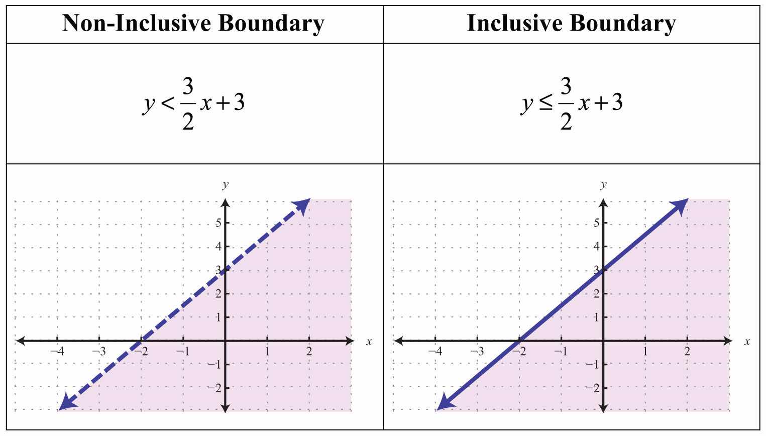 Solutions to linear inequalities are a shaded half-plane, bounded by a solid line or a dashed line. This boundary is either included in the solution or not, depending on the given inequality. If we are given a strict inequality, we use a dashed line to indicate that the boundary is not included. If we are given an inclusive inequality, we use a solid line to indicate that it is included. The steps for graphing the solution set for an inequality with two variables are outlined in the following example.