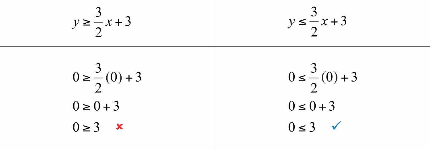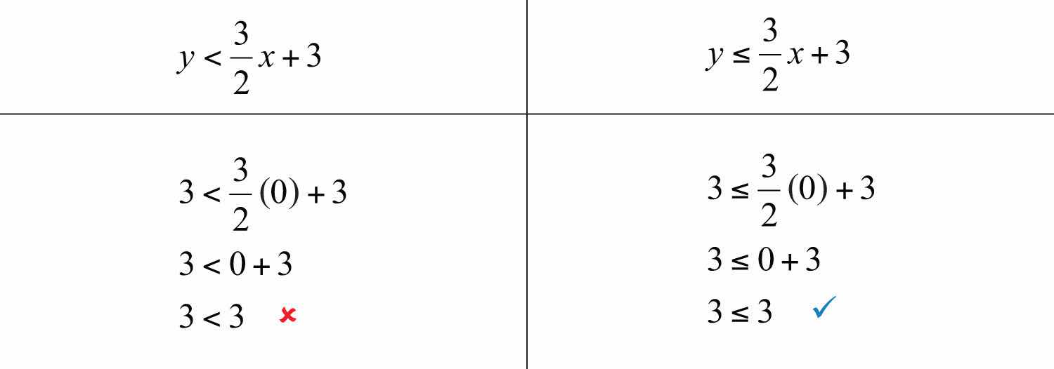 Consider the point (0, 3) on the boundary; this ordered pair satisfies the linear equation. It is the “or equal to” part of the inclusive inequality that makes it part of the solution set.