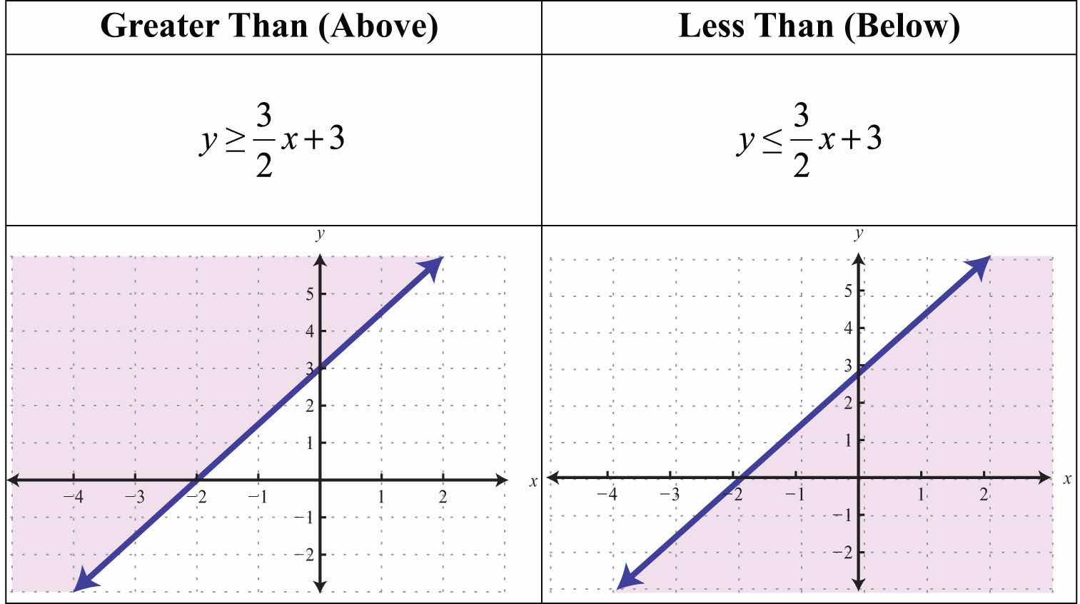 Consider the problem of shading above or below the boundary line when the inequality is in slope-intercept form. If y>mx+b, then shade above the line. If y<mx+b, then shade below the line. Use this with caution; sometimes the boundary is given in standard form, in which case these rules do not apply.