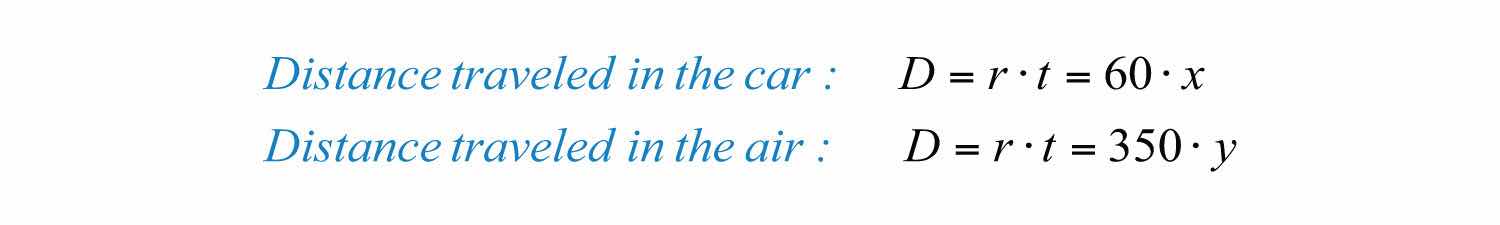 Example 7: An executive traveled a total of 8 hours and 1,930 miles by car and by plane. Driving to the airport by car, she averaged 60 miles per hour. In the air, the plane averaged 350 miles per hour. How long did it take her to drive to the airport?