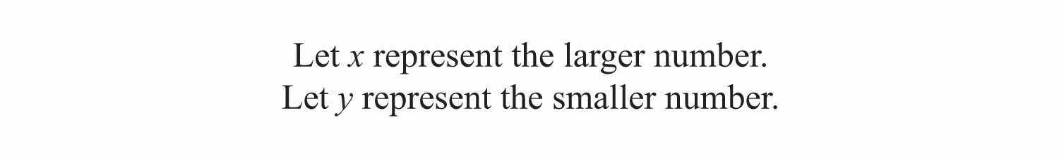 Set up equations: When using two variables, we need to set up two equations. The first key phrase, “the sum of the two numbers is 40,” translates as follows: