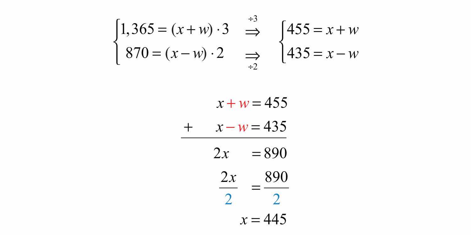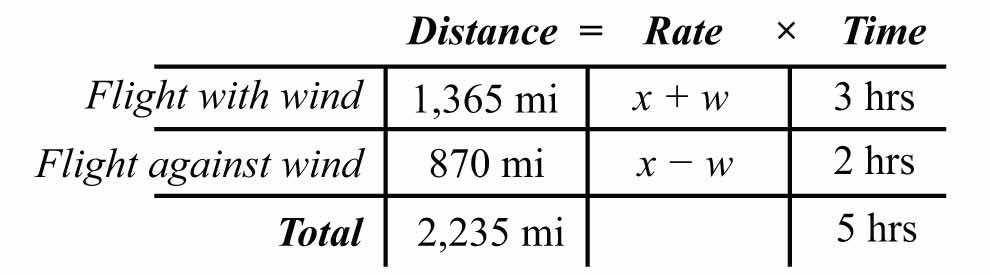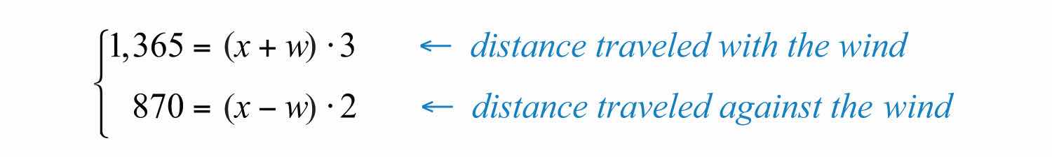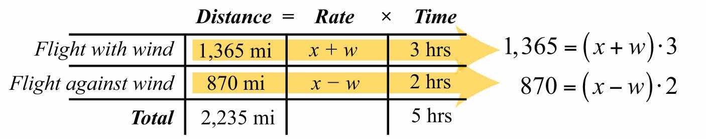 Example 8: Flying with the wind, an airplane traveled 1,365 miles in 3 hours. The plane then turned against the wind and traveled another 870 miles in 2 hours. Find the speed of the airplane and the speed of the wind.