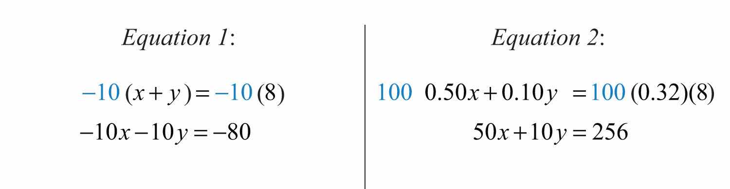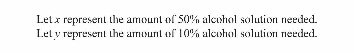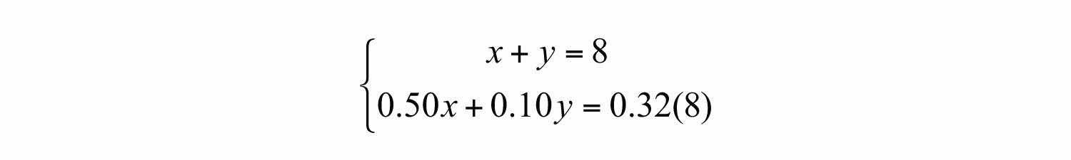 Example 6: A 50% alcohol solution is to be mixed with a 10% alcohol solution to create an 8-ounce mixture of a 32% alcohol solution. How much of each is needed?