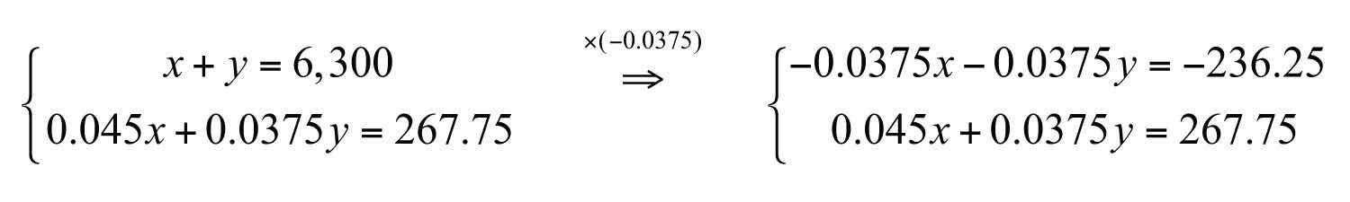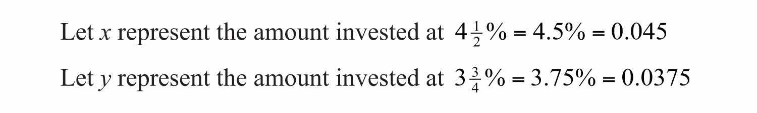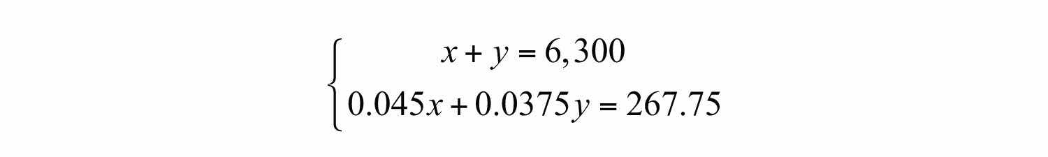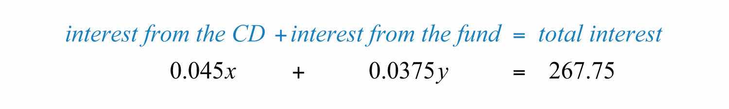 To set up a second equation, use the fact that the total interest was $267.75. Recall that the interest for one year is the interest rate times the principal (). Use this to add the interest in both accounts. Be sure to use the decimal equivalents for the interest rates given as percentages.