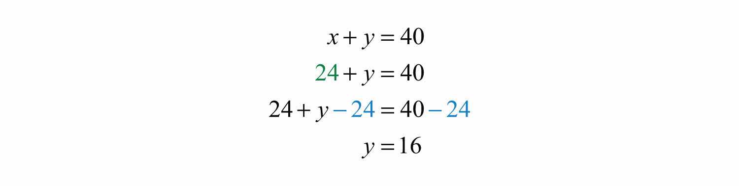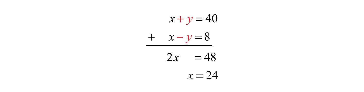 Example 1: The sum of two numbers is 40 and their difference is 8. Find the numbers.
