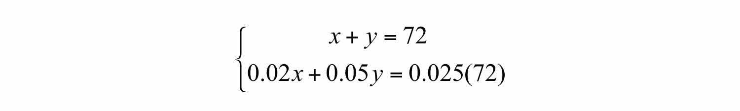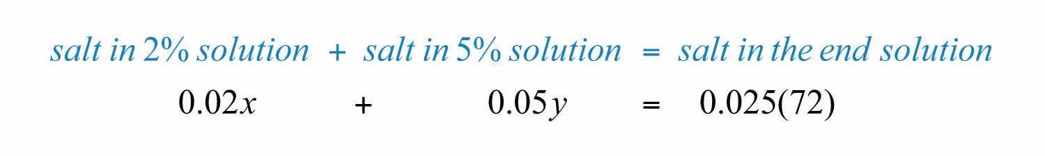 Example 5: A 2% saline solution is to be combined and mixed with a 5% saline solution to produce 72 ounces of a 2.5% saline solution. How much of each is needed?