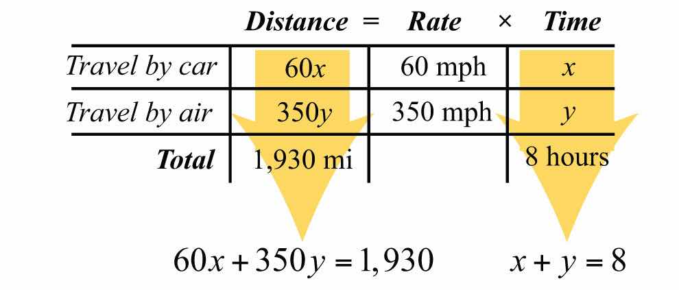 Recall that the distance traveled is equal to the average rate times the time traveled at that rate, . These uniform motion problemsApplications relating distance, average rate, and time. usually have a lot of data, so it helps to first organize that data in a chart and then set up a linear system. In this section, you are encouraged to use two variables.