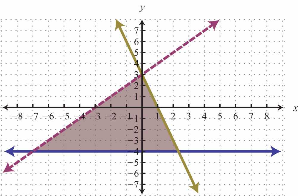 The graphic suggests that (−1, 1) is a common point. As a check, substitute that point into the inequalities and verify that it solves all three conditions.