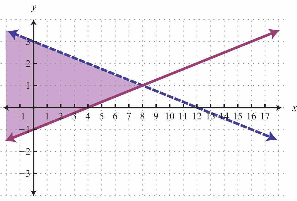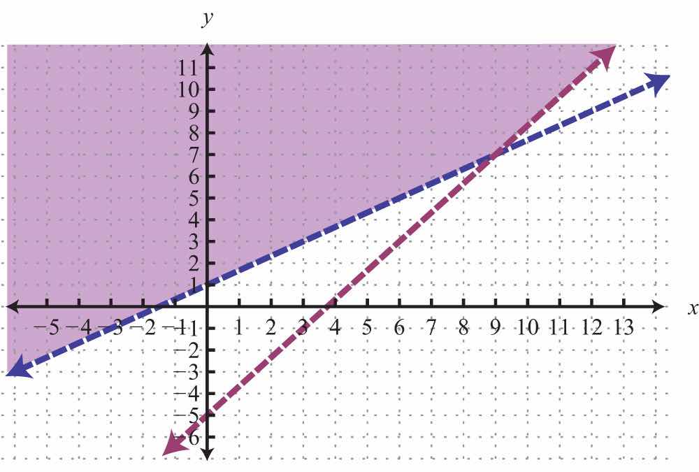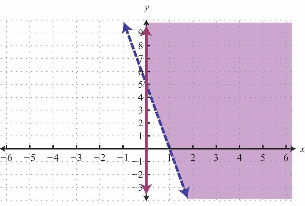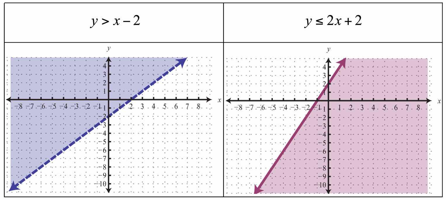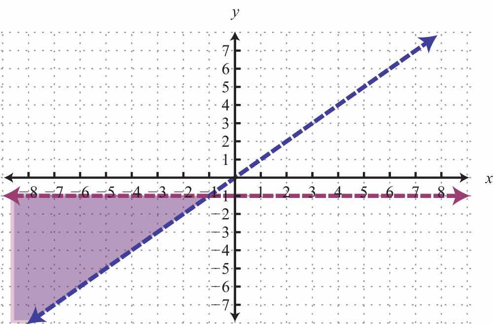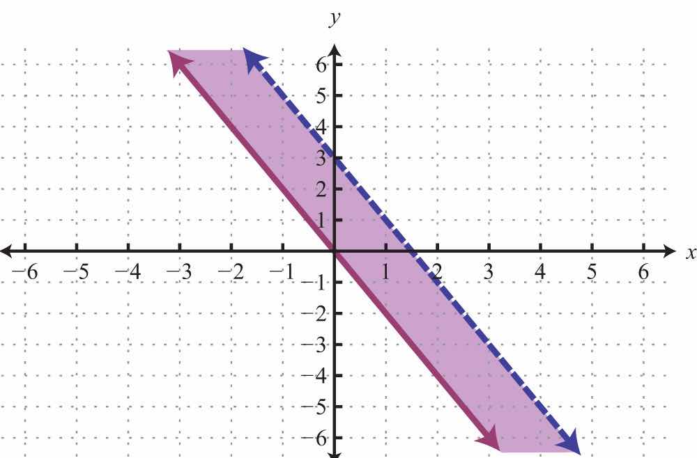 For the first inequality, we use a dashed boundary defined by and shade all points above the line. For the second inequality, we use a solid boundary defined by and shade all points below. The intersection is darkened.