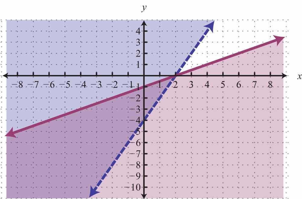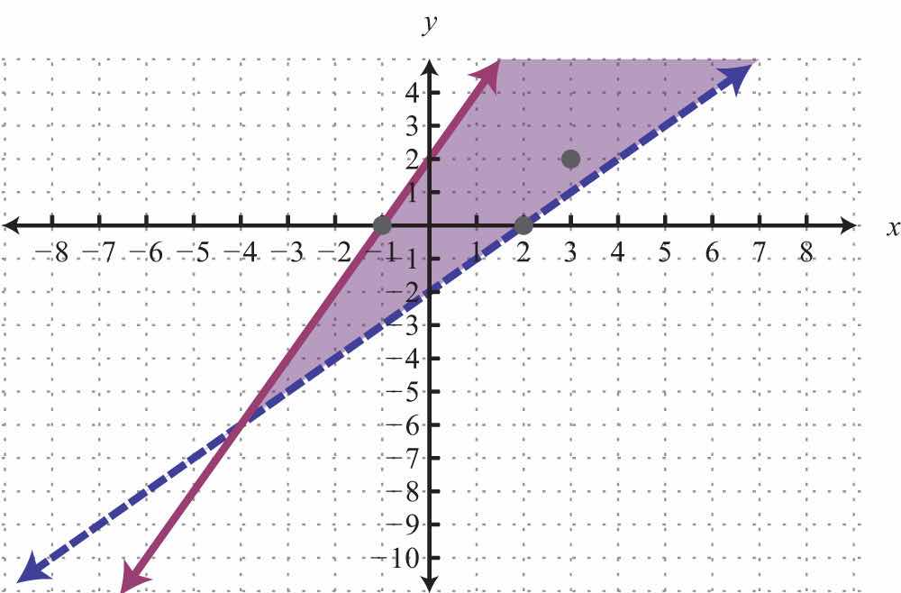 Notice that this point satisfies both inequalities and thus is included in the solution set. Now consider the point (2, 0) on the dashed boundary defined by and verify that it does not solve the original system: