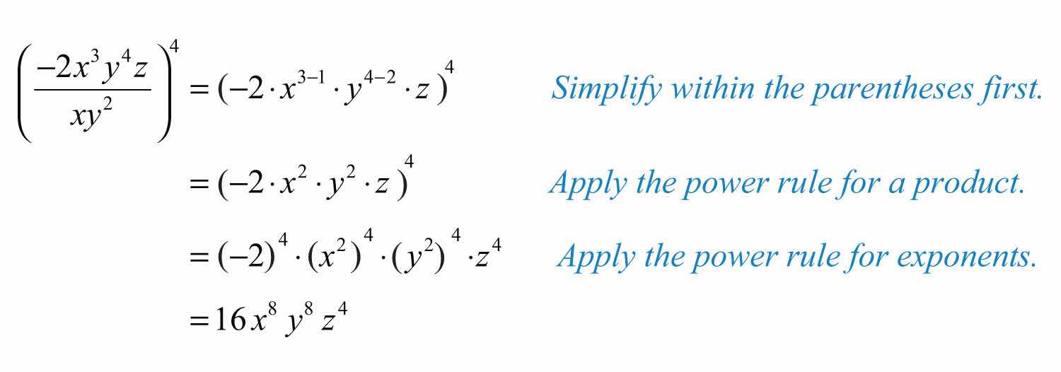 It is a good practice to simplify within parentheses before using the power rules; this is consistent with the order of operations.