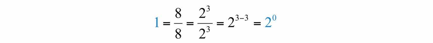 Eight divided by 8 is clearly equal to 1, and when the quotient rule for exponents is applied, we see that a 0 exponent results. This leads us to the definition of zero as an exponentx0=1; any nonzero base raised to the 0 power is defined to be 1., where x0: