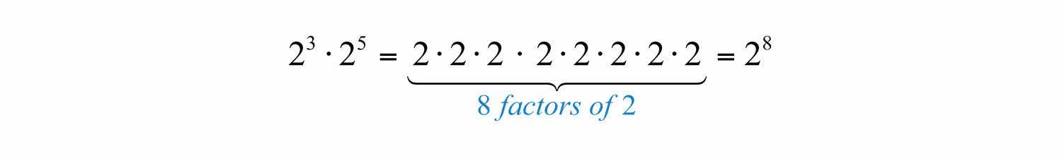 Expanding the expression using the definition produces multiple factors of the base, which is quite cumbersome, particularly when n is large. For this reason, we will develop some useful rules to help us simplify expressions with exponents. In this example, notice that we could obtain the same result by adding the exponents.