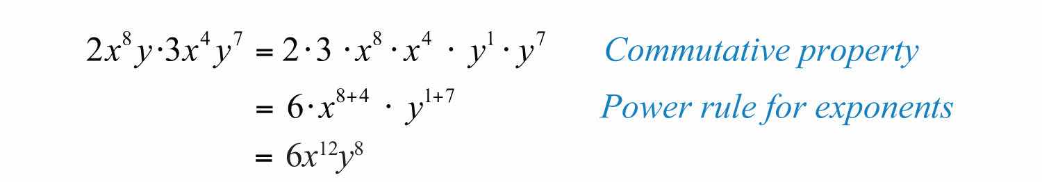 Solution: Multiply the coefficients and add the exponents of variable factors with the same base.