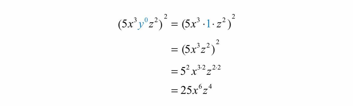 Example 17: Simplify: (5x3y0z2)2.