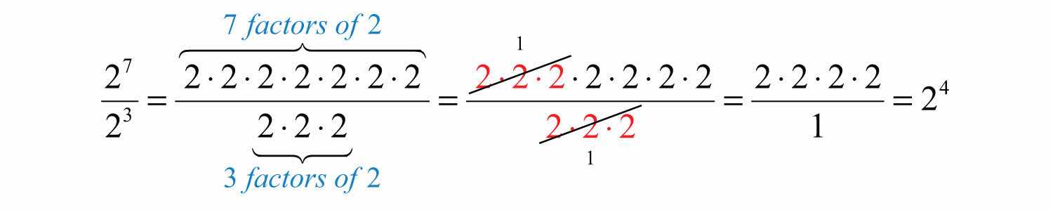 Here we can cancel factors after applying the definition of exponents. Notice that the same result can be obtained by subtracting the exponents.