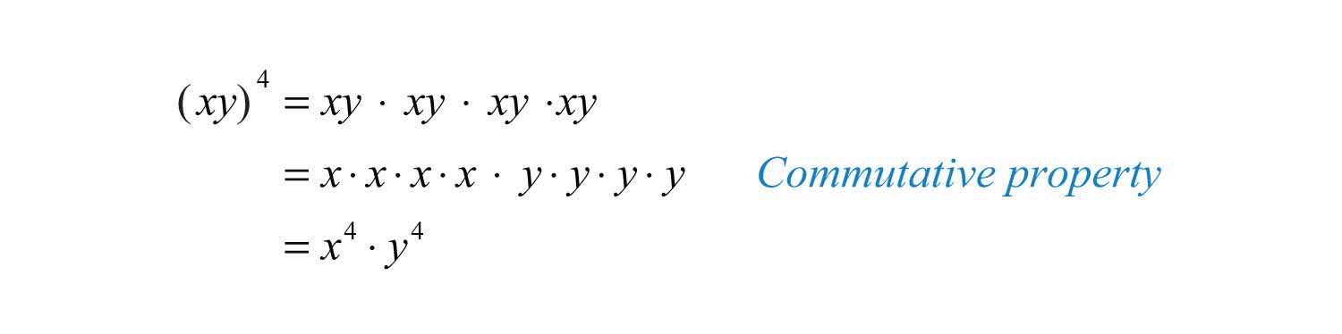 After expanding, we have four factors of the product xy. This is equivalent to raising each of the original factors to the fourth power. In general, this describes the power rule for a product(xy)n=xnyn; if a product is raised to a power, then apply that power to each factor in the product.. If n is a positive integer, then