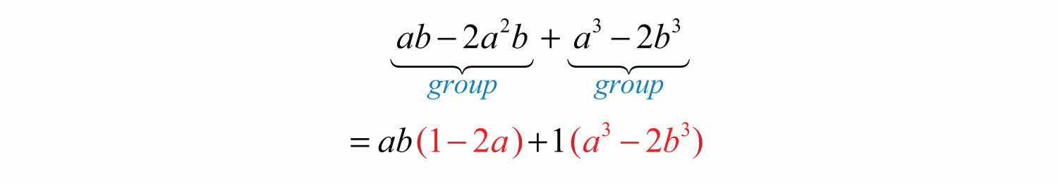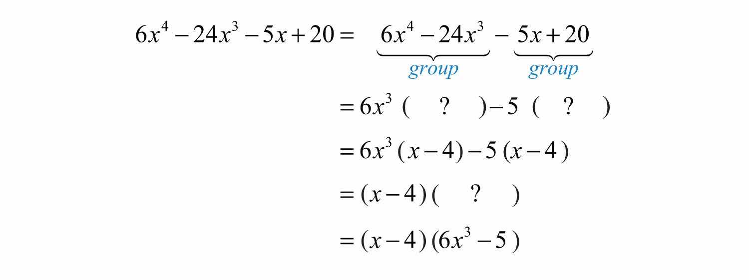 Remember that the goal for this section is to develop a technique that enables us to factor polynomials with four terms into a product of binomials. The intermediate step of this process looks like the previous two examples. For example, we wish to factor