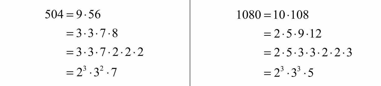The product of the common prime factors is 2332. The GCF(504,1080)=2332=72. Note that we multiplied the common prime factors with the smallest exponent.