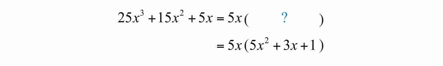 Solution: The GCF(25, 15, 5) = 5, and the common variable factor with smallest exponents is x1. The GCF of all the terms is 5x.